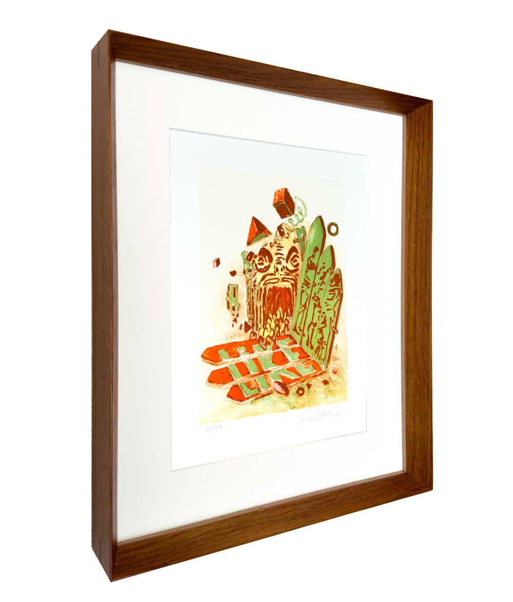 Vores håndlavede ramme, er noget af det fineste håndværk, man kan finde. Materialerne er nøje udvalgt og sammensat, så det fremhæver litografiet på bedste vis. Rammen er af massivt egetræ med indlæg af ibenholt. Glaslisten er i massivt egetræ.